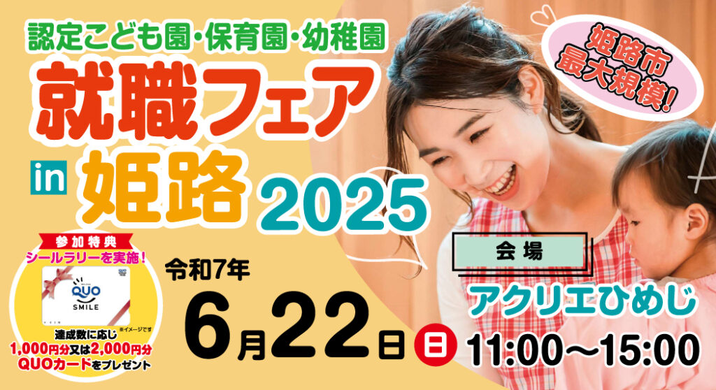 この度、姫路市私立こども支援機構では、姫路市で保育士・保育教諭になりたい!保育施設で働きたい!とお考えの皆さまを対象に「認定こども園・保育園・幼稚園 就職フェア in 姫路 2025」を開催いたします。